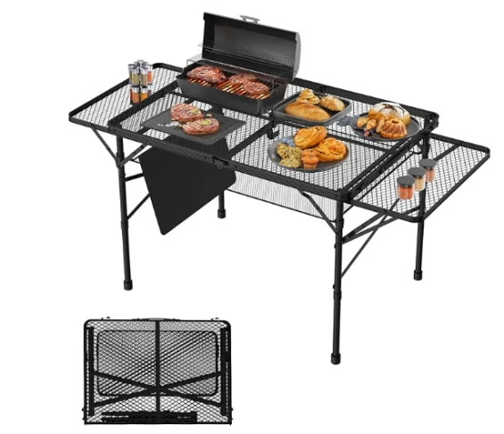 Alloy Camping Table Deyò Biwo Folding, plisman tab ak 2 panno zèl, 3x2 pye kan tab ak Desktop may, wotè reglabl tab plisman gri ak sak may, pòtab tab deyò pou piknik, kan, barbecue, plaj