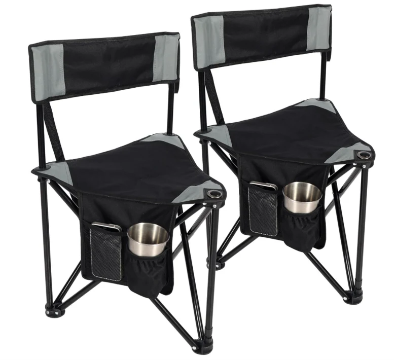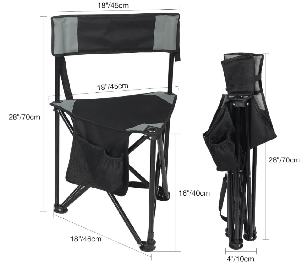Se chèz tripod pliyan, pòtab chèz plisman tripod ki fèt ak yon pòch bò, konpoze de yon detantè tas ak sak depo, ki se pi bon pou ou pou w mete atik pèsonèl nan nenpòt ki lè, tankou mobil. telefòn oswa bwason.