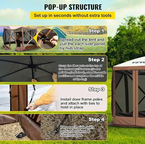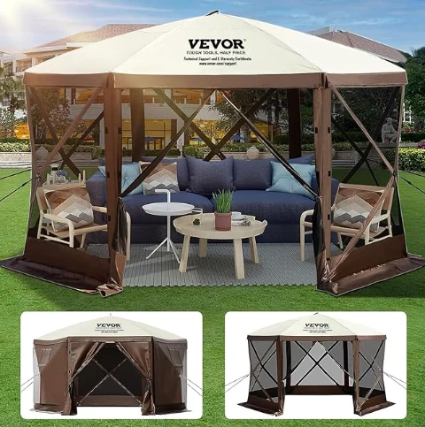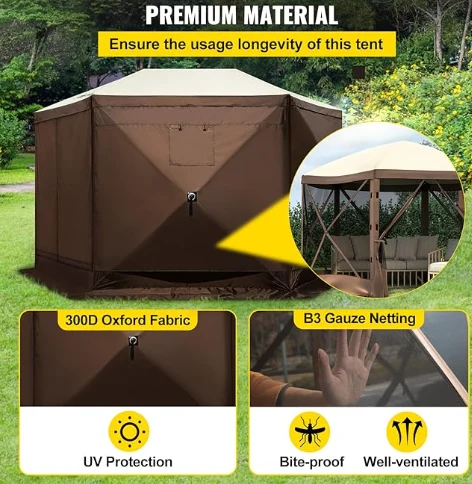 Rainproof Pergola Camping Canopy tant, kan Gazebo tant se te fè nan 300d twal Oxford ak B3 gaz konpansasyon. Li se IPX3 ki enpèmeyab, mòde-prèv, ak UV-prèv. 12 'x 12' canopy a Gazebo bay yon gwo espas pou itilize abri deyò.