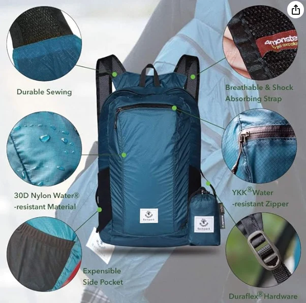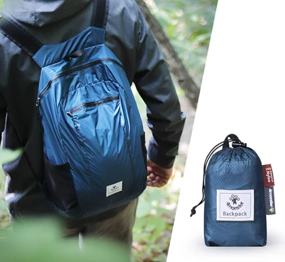 Ki enpèmeyab sakado ki lejè randone, sa a se daypack randone ki lejè te fè nan dlo ki reziste materyèl ak zip. Efektivman anpeche dlo lapli soti nan pipi nan telefòn lan oswa lajan kach ak lòt atik nan valiz lekòl la.